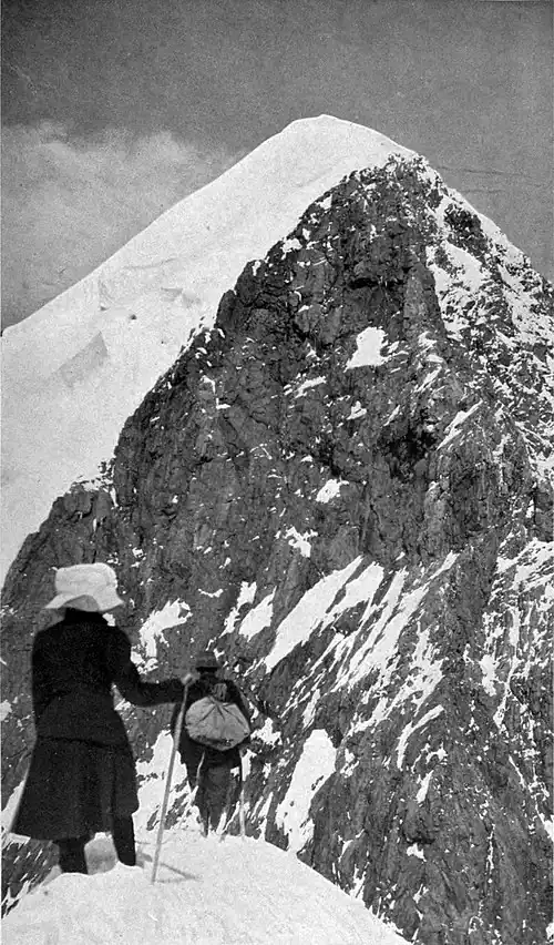 At 6 a.m. we came to the end of our steps, but it was not yet daylight. We crossed the plateau, keeping to the right of the south-west arete of the Silberhorn, and made for the broken ice through which we had to pass to gain the saddle between Mount Lendenfeld and Mount Haast.