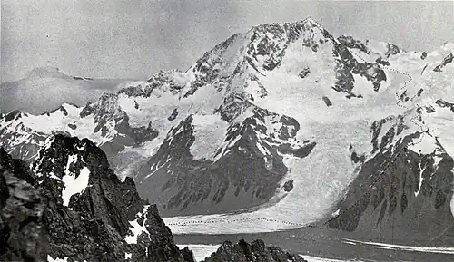![]() NORTH-EAST FACE OF MOUNT COOK. Dotted line shows the route of descent used on the traverse. |