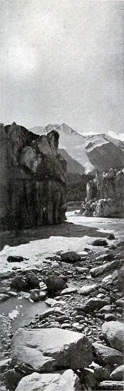 Meanwhile on March 6th we made the first ascent of a hitherto unnamed rock peak immediately north of the Footstool. We climbed it from the Hermitage, leaving at 4.45 a.m. The day was cold and sunless and encouraged rapid movement. We followed the east arête between the Eugénie and Stuart Glaciers. It is a long but comparatively easy rock route which leads on to a steep snow slope seamed with a big crevasse. The crevasse once negotiated, we gained the rocks again and reached the summit at 10.15. The aneroid height was 8,472 feet. I took a first-climber's privilege and named the peak Mount Cadogan. My chief object in ascending it had been to take a photo of the back of Mount Sefton showing our route on the descent, but the day was so dull and cloudy that the results were a failure. While we were on the summit it began to snow, and as the wind was bitterly cold we scuttled down again with all haste. We had some splendid glissades on the descent which brought us to the valley in a most cheerful frame of mind. In the morning, walking along the Hooker path while it was still dark, we had been greatly puzzled by a continuous dull boom that rose from the river, so now we decided to investigate the matter. Leaving the path we climbed over the moraine in the direction of the sound, and soon stood on a bank 20 feet above the water. For a minute all was silence and then with a roar up shot a 10-foot shower of stones and water. The Muller River had found an exit from its prison beneath the glacier under a great ice wall some 50 feet in height, and every few moments it played at being a geyser. The whole spot was most picturesque: the recent floods had washed the dirty moraine to clear ice, and the force of the water had in one place undermined it, leaving a bridge, a perfect arch of white ice, spanning the foaming river, which framed a charming view of the distant mountains and was an immense asset to the scenery.