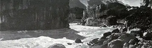 On reaching home we reported our discovery, and for days until the sun melted the arch the spot was a favourite afternoon walk for the inmates of the Hermitage. I spent one morning photographing there, and got the fright of my life when a huge pinnacle overhanging the river broke away and fell with a tremendous