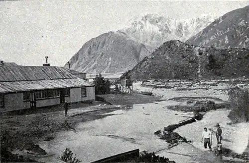 The poor old Hermitage was a wreck, damaged beyond all hope of mending. It was evident, too, that whenever there was unusually heavy rain or melting snow it would be inundated, thanks to the breakaway in the moraine. Another flood would probably carry away the main building or damage it so much that it would not be fit to live in. A mile away down the valley a big new hotel was commenced a year ago and will soon be finished. A fashionable place with tennis courts, golf links, etc., where you will have to dress for dinner and play about in pretty clothes—in fact, a fashionable tourist resort. The old happy, carefree, home-like days spent in the ugly rambling cottage building were over. Many a time the climbers and beauty lovers had suggested that they should form a syndicate and purchase the old place for themselves, and so keep the old home-like ways and let fashion rule in the valley. Now this hope was doomed, the old place must go. Very sad it made me to look back for the last time at the dear old building under whose roof I had spent some of the happiest days of my life, and know that I would never see it again. As the car rushed away across the plains a mist for a moment blotted out the towering mountains, the blue sky, and the brown faces of my comrade-guides; with a lump in my throat I waved a last farewell. Life is opening out. I may see many lands and make many friends, but as long as it shall last I will carry with me an imperishable memory of that happy home among the mountains, memories of good friends and true, of brave deeds quietly done—days of exultation and triumph, days of sorrow and failure. Love, freedom, and peace, with beauty unutterable brooding on the star-lit heights and the winding valleys; dear home of hopes and dreams, may fate some day bring me back again to wander in well-remembered ways, but now