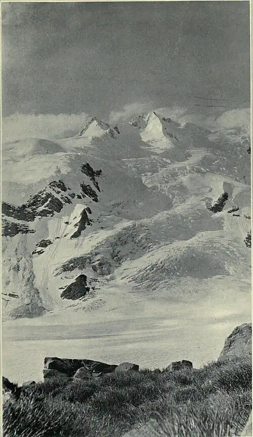 On January 6th the weather seemed to have definitely cleared, so we set out for the Ball hut, accompanied by Peter Graham. We reached the hut the same evening, just in time to climb up the wall of Moraine that shuts out the view, and see the last glories of the sunset. In the quivering air of the midsummer evening the strange black waves of moraine, tipped here and there with crests of white ice, seemed really to undulate like some uncanny sea. Beyond their black depths shimmered mile after mile of pure white ice, which rose in a grand curve at the ice-fall and swept round the base of Mount de la Beche and the Minarets and on to the head of the glacier; here they lost themselves in the rounded softness of the Hochstetter Dome. In contrast with the white of snow-clad peaks and curving glaciers, Mount Malte Brun reared its great rock ridge from the crevassed ice at its base, and towered up with crag after jagged crag outlined sharp against the ever-changing evening sky. As the sun disappeared into Westland its last rays dyed the black pyramid to a glowing mass of molten copper, till one could but believe that some volcanic fire was welling up from the unseen heart beneath. We watched till the last vestige of colour faded and the surrounding mountains turned grey and cold, and then scrambled down to the hut, and thoroughly enjoyed the evening meal which Graham had been preparing while we absorbed the beauties of nature.