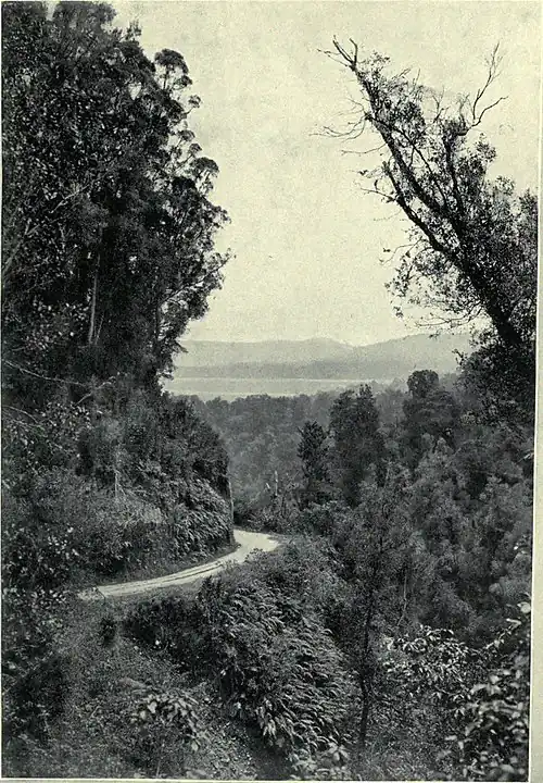 We left Williams's at 2.30 p.m. for our seventeen-mile ride over the range to Waiho Gorge and the far-famed Franz Josef Glacier. We followed a rough mountain track, the embankments of which were smothered in a profusion of beautiful ferns and mosses. It rained lightly all the way, just enough to obscure the distant view and keep us cool.