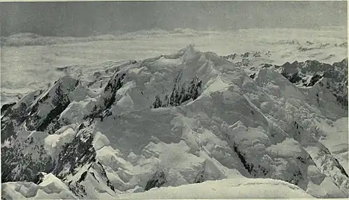 After fixing up the bivouac and having an hour's rest, the guides set off to kick steps for the morning, so that we could start before dawn; returning about 5.30 p.m., they reported everything in a most satisfactory state. They had walked over the schrund at the junction of rock and snow which had blocked us the year before, and followed up a snow couloir for about 1,000 feet. These steps would save us some stiff rock-work in the morning and about an hour in point of time. Cheered by such news as this, dinner was a jubilant meal; and after it was over we crawled into our sleeping-bags as a protection against the evening chill and waited for the sunset. The fog was rapidly clearing, and as the setting sun's rays pierced through the thin mist there began a series of the most wonderful colour effects it is possible to imagine. They were beautifully soft and yet extraordinarily vivid. We saw the distant mountains through a luminous curtain of softest transparency. Away on the horizon outlined against pale green evening sky rose peak after peak vivid with an edge of purest gold; the nearer cones were touched with violet and rose, while over Baker's Saddle drifted soft little clouds of crimson and gold, which shattered themselves into rainbow mists and vanished as they touched the rugged, sun-warmed rocks that impeded their westward flight. The changes of colour were so quick it was impossible to follow them—they were here and gone in a breath. No voice was raised above a whisper; we seemed to be watching some scene in fairyland that at a sound would vanish and leave us dazed and desolated. Slowly the colours faded and the mountains were blotted out by the shadowy twilight, and innumerable stars glinted from the deep blue sky. The pageant was over, the day was done, and we who had witnessed it crept quietly to sleep, awed by a beauty such as one sees but once in a lifetime.