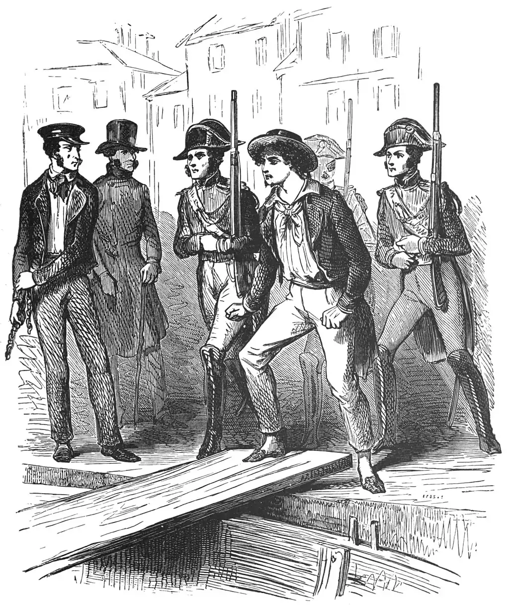 His guardians, taking hold of his arms and collar, forced him to rise and land, and dragged him toward the steps that lead to the gate of the fortress, whilst the exempt followed, armed with a carbine and bayonet.