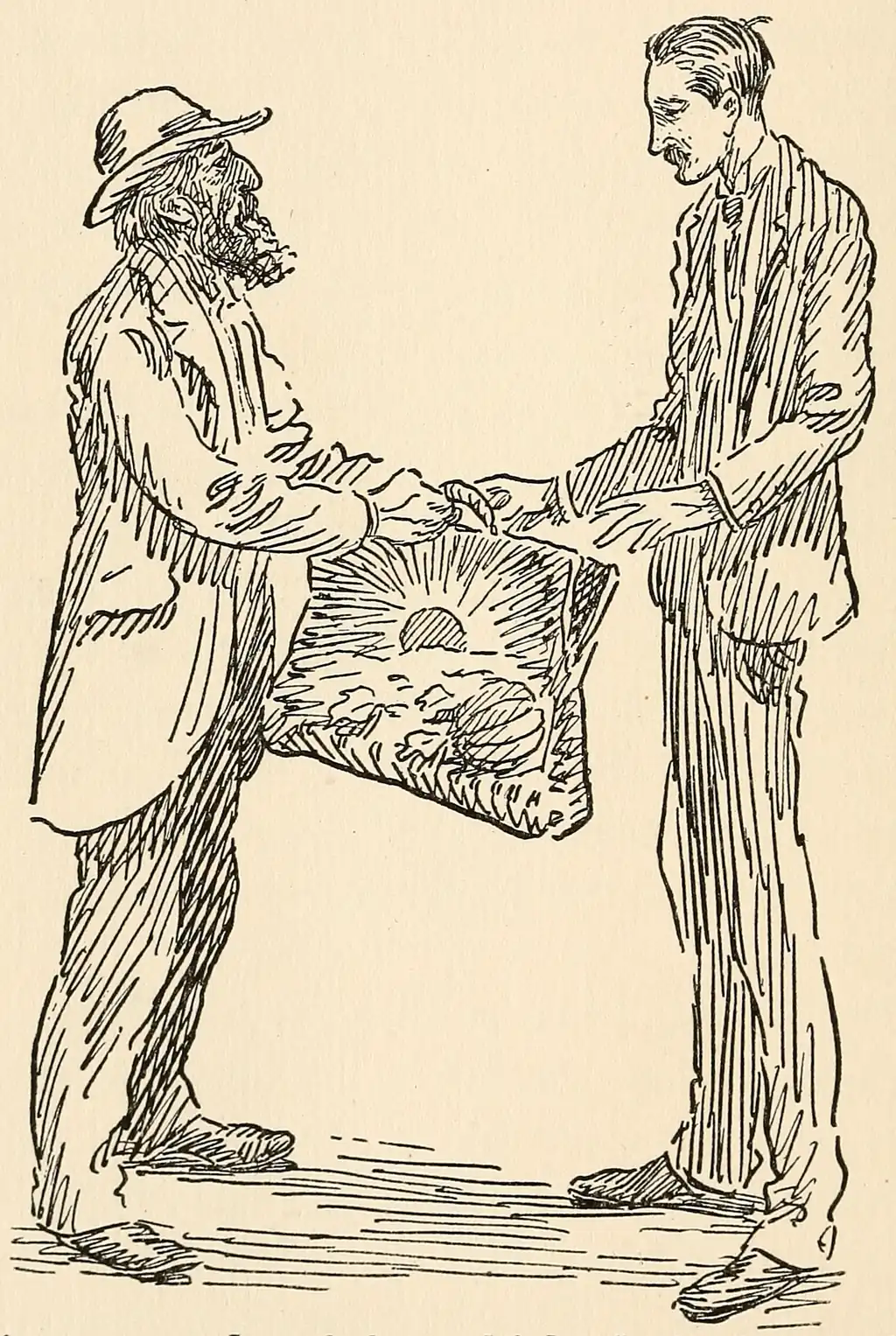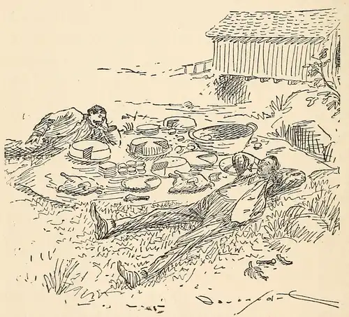I looked under the seat-curtain and saw a sight that I didn’t soon forget. It was an enormous dishpan of high polish, the contents of which were concealed by a clean linen tablecloth over the top. I lifted the cloth, and could perceive that it was a most bountiful dinner. I felt faint and weak and grabbed the buggy wheel. Then I called Patton, and when he looked, his countenance changed from that of the humiliated athlete to that of a victor. We thought it belonged to someone on the ground, so we lost no time in driving away with it.
