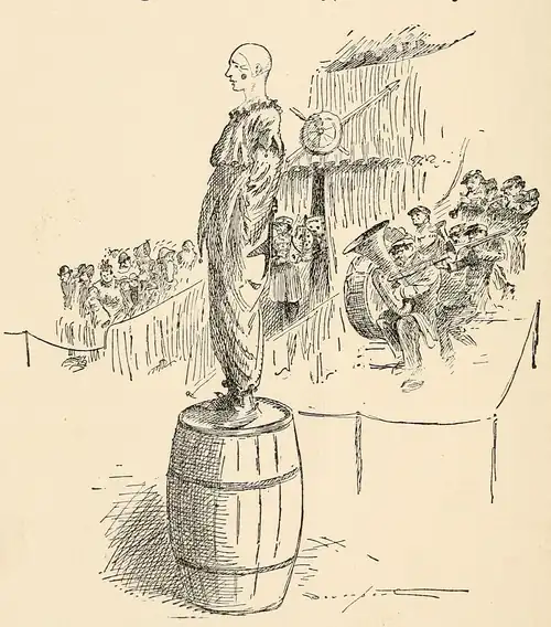 I heard from some of the neighbors that it looked bad, owing to father’s standing in the State as a man, but I went ahead. I learned to sing the clown’s song while standing on a barrel, with brass band accompaniment, and at that I did fairly well, if the band played loud; but Joe McMahan, the manager of the circus, thought I ought to do more, so I tried the spring-board. They had led up an old elephant and a horse with spots on him. All the acrobats and tumblers ran down this steep incline and hit the spring-board, and went up and turned from one to three somersaults, going over the elephant and horse, and lit on a big straw tick on the other side. My clown makeup consisted of a heavy, ponderous stomach, also made of straw. I’d never jumped on a spring-board, and no one explained to me the angles at which it was best to hit. I took a long run as I hit the spring-board. I evidently hit it too high up, and instead of going up over the elephant and horse, I cushioned back up the spring-board, lit on the back of my neck, and fell off among the brass band. It made a tremendous hit with the audience, notwithstanding that it nearly broke my neck.