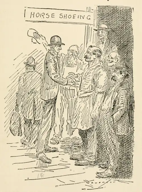 It was a lucky thing for Ben Davenport that he got hold of the bay horse, as most all of the property that he accumulated afterward was directly or indirectly due to the big bay horse. Everybody that came into that part of the country owned him at least a day, and he put several gypsy camps out of business. Whenever a stranger came over the road, Uncle Ben had occasion to go out with the big bay; and unless the man knew the horse he couldn’t resist giving everything he had for him, and a little to boot. After he was traded off, Uncle always came to the family with a smile and said: “Well, I have done great business to-day. I’ve got rid of old Broadfoot.” All of our family would plead with him to stay rid of him. He’d promise never to get him back again; but inside of twenty-four hours, he came with just as broad a smile and said, “Well, I’ve got back the big bay.” And it was through that kind of operations, the rake-off, as it were, that went to the kitty, that Uncle Ben got a good financial start. He traded and retraded the horse for years. Every time he passed out he was called “Old Broadfoot,” and every time he came back he was the “Big Bay.”