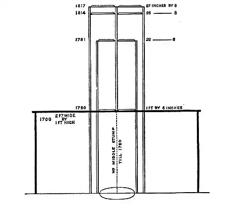 The old players well understood the art of twisting, or bias bowling. Lambert, "the little farmer," says Nyren, "improved on the art, and puzzled the Kent men in a great match, by twisting the reverse of the usual way,—that is, from the off to leg stump." Tom Walker tried what Nyren calls the throwing-bowling, and defied all the players of the day to withstand this novelty; but, by a council of the Hambledon Club, this was forbidden, and Willes, a Kent man, had all the praise of inventing it some twenty years later. In a match of the Hambledon Club in 1775, it was observed, at a critical point of the game, that the ball passed three times between Small's two stumps without knocking off the bail; and then, first, a third stump was added; and, seeing that the new style of balls which rise over the bat rose also over the wickets, then but one foot high, the wicket was altered to the dimensions of 22 inches by 6, at which measure it remained till about 1814, when it was increased to 26 inches by 8, and again to its present