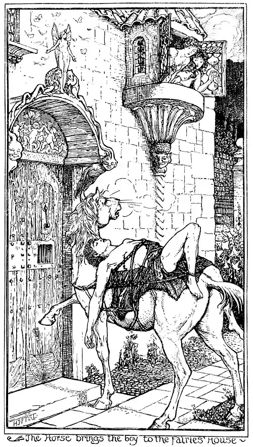 The ogre had happened to choose a horse which he had bought only the day before, and he did not know it was a magician, or he would not have been so foolish as to fix upon it on this occasion. The horse no sooner had been driven off with the prince’s body on its back than it galloped straight to the home of the fairies, and knocked at the door with its hoof. The fairies heard the knock, but were afraid to open till they had peeped from an upper window to see that it was no giant or ogre who could do them harm. ‘Oh, look, sister!’ cried the first to reach the window, it is a horse that has knocked, and on its back there is hound a dead boy, the most beautiful boy in all the world! Then the fairies ran to open the door, and let in the horse and unbound the ropes which fastened the young king on its back. And they gathered round to admire his beauty, and whispered one to the other: ‘We will make him alive again, and will keep him for our brother.’ And so they did, and for many years they all lived together as brothers and sisters.