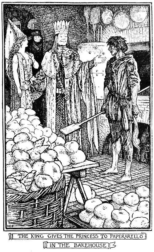 Now Paperarello, who was passing through the hall where the king was giving his orders, heard these words, and said: ‘Your Majesty, have no fears; I will bake your bread.’ ‘Very well,’ answered the king; ‘but if you fail, you will pay for it with your head!’ and signed that both should leave his presence.