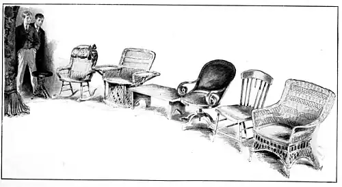 But when, finally, the stage was set and the boys stood off at a respectful distance and examined it it really looked very well. Chub admired the effect of distance and wondered where the path led to. Warren said he'd like to meet the man who had chiseled out the statue under the trees and another fellow wanted to go bird-egging. Then they arranged the chairs and benches in rows. They had gathered chairs of all descriptions from all over the school and the effect was finely democratic. Doctor Emery's leather arm chair hobnobbed socially with a plain pine chair from the dining hall and Mr. Buckman's favorite hour-glass chair appeared to be trying to make an impression on Harry's rattan rocker, the latter looking very dressy with its pink silk head-rest.