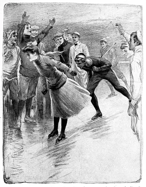 And skate they did, the cherry-red jersey and the brown sweater. Schonberg made a last despairing effort when twenty feet from the line and fairly ate up the ice, but even as he did so Harry brought her feet together, pulled herself erect and slid over the finish three yards ahead, beating her adversary, as Chub said, "in a walk!"
