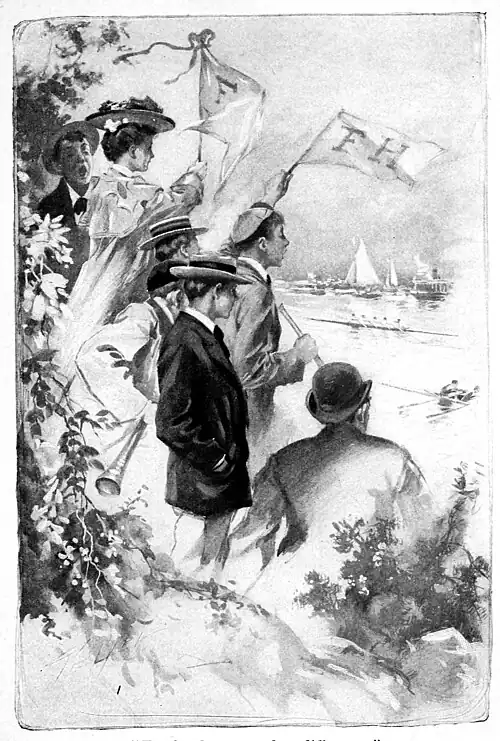 The crews had gone up the river half an hour before, the men making the trip to the starting point in comfortable launches, their shells streaking along in tow. The time for starting the race was already past and everyone about the finish was eagerly awaiting the distant boom of the tiny brass cannon aboard the referee's launch which would announce to them that the struggle had begun two miles away.