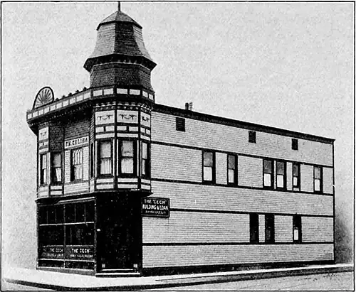 The first organization of Czechs in Cleveland was formed in May, 1862, as a branch of “Slovanska Lipa” (the Slavonic lime-tree), The lime-tree is the national tree of Bohemia, and this name was in Austria a subtle designation of race. On November 16, 1863, this little group of poor immigrants demonstrated their devotion to dramatic art by a performance which they staged in the fire-engine house on East 22nd street. This first performance was followed by others, and funds were accumulated for a community hall which in 1871 was built at the corner of Croton avenue and East 40th street, and named “Slovanska Lipa.” It is still in use for its original purpose, although it has passed into private ownership, and it is not now so popular as the newer and larger halls, which are more centrally located.