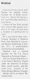 Funeral services will be held Monday for Anthony Julius Winblad, 88, of 66-442 Desert View Avenue, Desert Hot Springs, who died Thursday following a long illness. A native of New York, he had been a Desert Hot Springs resident of 15 years. He had been a resident of California for 25 years. He is survived by three sons, Norman Winblad of Baldwin Park; Earl Winblad of Carson, and Russell Staderman of Buffalo, New York; 12 grandchildren and 14-grandchildren. Winblad was a retired plumber for the U.S. Naval Shipyard on Terminal Island. Services will be held at 9 a.m. in the Desert Mortuary Chapel under the direction of George Hilla, senior warden, and Edward Gray, chaplain of the Palm Springs Masonic Temple. Burial will be in Desert Memorial Park.