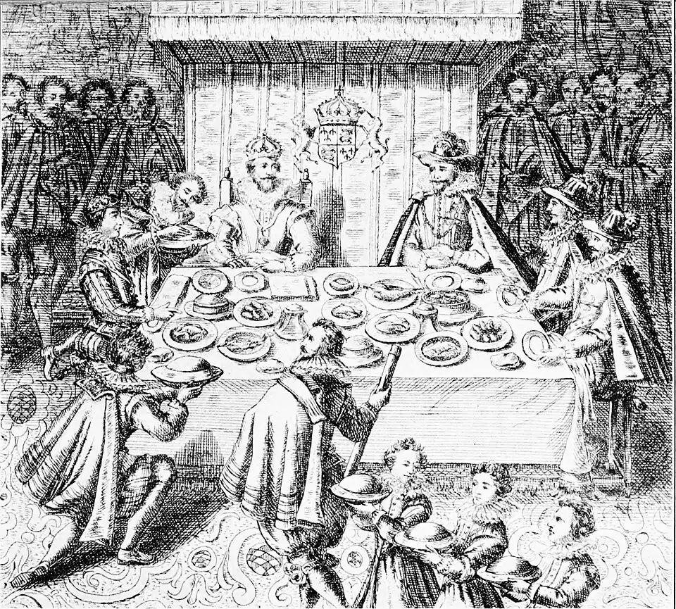 It is interesting to set beside this a description of the more sociable kind of state dinner enjoyed by Elizabeth's successor, King James. The description is from the pen of Juan Fernandez de Velasco, Ambassador of Philip III. to England in 1604.[2]