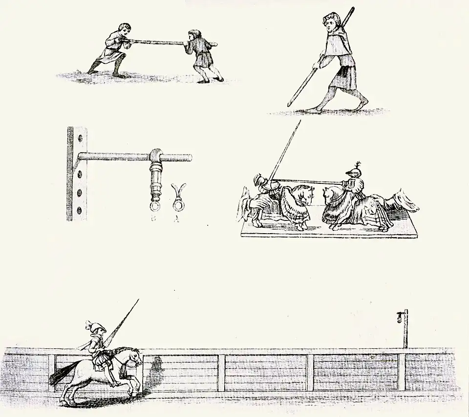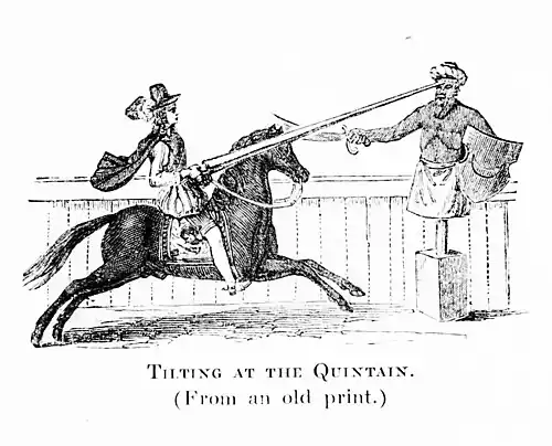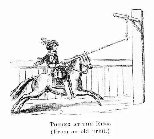 Tilting was one of the popular amusements of the day, carried on in harmless sport far different from the dangerous joustings of mediæval times. The following is a condensation of Holinshed's description of a famous tilting before the Queen on Whitsun Monday and Tuesday, 1581: