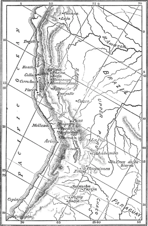 Situate in the tropic of Capricorn Peru has every climate known in the world, ranging from the torrid zone at the sea level to the eternal snow of her Cordillera. The Creoles of Peru were by nature intelligent, and cultivated science and the arts. They had also a literature of their own. The Mercurio Peruano, published in the eighteenth century, was the first periodical printed in South America. The University of Lima was as famous in America as that of Salamanca in Spain; the skill of her physicians was renowned all over the continent. Peru was also the centre of the Royalist reaction; for ten years she had held the revolution in check. Thus it was when the emancipating armies from the north and from the south closed in upon her in the year 1820. She was the Carthage of San Martin.