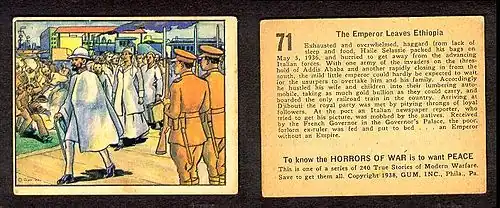 Exhausted and overwhelmed, haggard from lack of sleep and food, Haile Selassie packed his bags on May 5, 1936, and hurried to get away from the advancing Italian forces. With one army of the invaders of the threshold of Addis Ababa and another rapidly closing in from the south, the mild little emperor could hardly be expected to wait for the usurpers to overtake him and his family. Accordingly he hustled his wife and children into their lumbering automobile, taking as much gold bullion as they could carry, and boarded the only railroad train in the country. Arriving at Djibouti the royal party was met by pitying throngs of loyal followers. At the port an Italian newspaper reporter, who tried to get his picture, was mobbed by the natives. Received by the French Governor in the Governor's Palace, the poor, forlorn ex-ruler was fed and put to bed...an Emperor without an Empire.