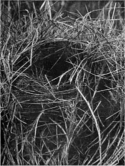 I found a second nest from which the young had flown, also near Milly Pool. This was very low down in a small salt-bush. The parents, with their brood, were near at hand. This nest, too, was much disordered, so that I cannot give a precise description of it. It was dome-shaped, with the entrance at the side but not so near the top as in the case of a Malurus nest. Outwardly it was constructed of soft strips of bark, wound round rather than interwoven. The interior was lined with finer bark, with a few feathers and flakes of rabbit fur. The Lake Violet nest was similar, but the remains of an old chaft-bag had been used in the lining, and a piece may be seen in the photograph hanging out of the entrance. (See illustration.)