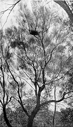 On the following day I determined to make a thorough search in the immediate neighbourhood for any signs of nesting, past or present. In a couple of casuarinas, less than half a mile away, were two nests very much like those of the Tooth-billed Bower-Bird depicted in Mr. Sid. W. Jackson's photographs. They were both built of small, dead twigs, with a lining, if it could be called such, of needles from the casuarina tree. Both had an unoccupied look about them, though otherwise in good preservation. For the size of the bird they appeared small, but there was no other surrounding species to which they could belong. They were altogether too unsubstantial for old nests of Cracticus leucopterus. I felt sure they were last season's nests of the local Bower-Bird. However fascinating and exciting all this was, there was other work to do, and I determined to clear up the mystery respecting the Ptilotis I had seen when I drove out.