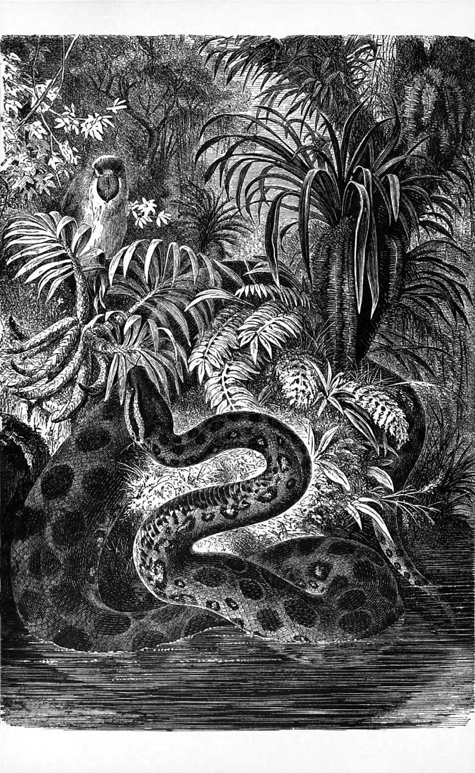 ANACONDA, a South American constricting serpent, the water-boa (Eunectes murinus). This is the largest of the boas (q.v.), and like the Ceylonese python (to which name originally belonged), may exceed 30 feet in length. It inhabits the swampy forests of the Amazonian region, where it is unpleasantly numerous and greatly feared by the natives, although not at all aggressive toward mankind, which it seeks to avoid rather than to attack. Like other boas it may hang from tree-limbs awaiting chance prey passing beneath, which it may seize and, by throwing powerful folds about its body, crush to death, meanwhile holding firmly to its support by its prehensile tail. Having crushed the animal, if large, into a sausage-like mass it descends and slowly swallows it, after which it lies quiet for a long time while the meat is digested. In captivity, for these reptiles are common in zoological gardens, several months sometimes elapse before another meal is wanted. It is rarely found far from water, and the larger part of its time, as a rule, is spent lying in the water or partly submerged on the bank, where it can seize small aquatic animals and swimming birds, which constitute most of its fare. The nostrils in this species open at the top of the snout in adaptation to this aquatic habit. During the day these water-boas live in holes in the bank, whose entrances are likely to be under water, and usually go forth only at night in search of food. Although strong enough to overcome animals as large as a jaguar or a crocodile, it will not attempt to swallow one larger than a medium-sized dog. The females produce their young alive at irregular but long intervals and in varying numbers, one captive specimen in New York yielding 34 at a birth; but few of these survive the risk of drowning or the attacks of eagles, peccaries and other enemies.