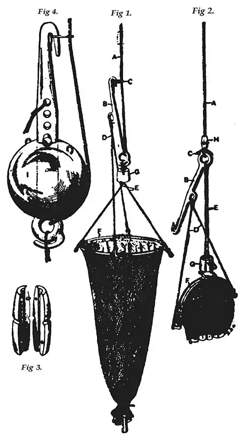 | Fig. | 4.—Showing heavy tripping arm used on steamer Albatross, with 60-pound sounding shot attached as sinker for proper strain on wire tow line in deep-sea work. |