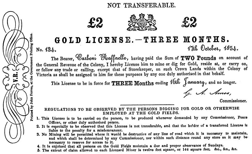 - ↑ The original Document of the following Gold-licence, as well as the Documents from David Burwash, Esq., the eminent notary-public of 4, Castle-court, Birchin-lane, City, London; and Signor Carboni Raffaello's College Diploma, and Certificate as sworn interpreter in said City of London; together with the Originals of all other Documents, especially teh letters from C. Raffaello to H. W. Arcer, inserted in this book, are now in the hands of J. Macpherson Grant, Esq., M.L.C. Solicitor, and will remain in his office, Collins-street, Melbourne, till Christmas, for inspection.——The Printers.