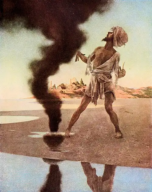 - "The Fisherman and the Genie", edited by Laurence Housman, illustrated by Edmund Dulac, in Stories from the Arabian nights (1907) [2 color plates, b&w illustrations]