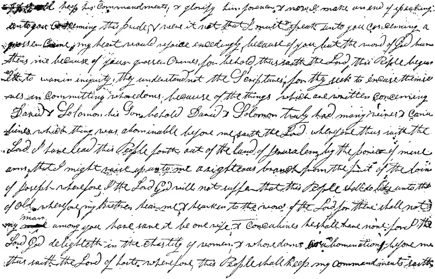 Leaving these material signs, there remain verbal and literal tests[60] for determining the further question of date, for finding out how early this document really was. From a comparison of several passages with the first three editions of the Book of Mormon, from a close scrutiny of spelling, punctuation, capitalizing and phrasing, it is fair to conclude that this is a complete contemporary copy transcribed from the original. There may be taken in evidence of this the famous anti-polygamy passage reproduced on the opposite page.[61]
