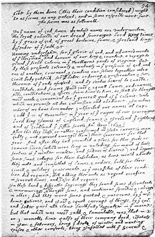 - ↑ The compact is in Bradford, Plymouth, pp. 89 f.; the list of signers in Morton, Memorial, p. 26.
