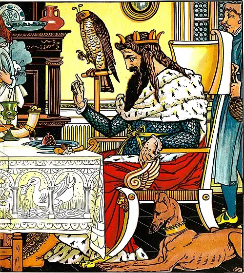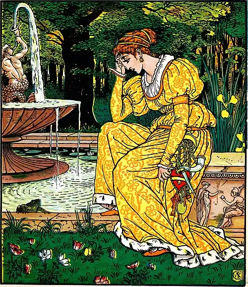 “Oh, dear father, when I was sitting yesterday playing by the fountain, my golden ball fell into the water, and this Frog fetched it up again because I cried so much: but first, I must tell you, he pressed me so much, that I promised him he should be my companion. I never thought that he could come out of the water, but somehow he has jumped out, and now he wants to come in here.