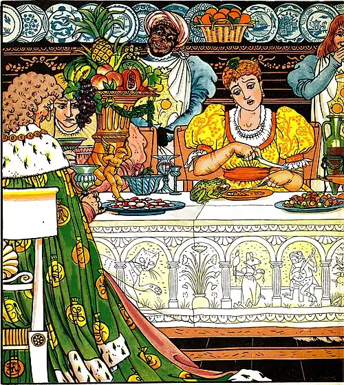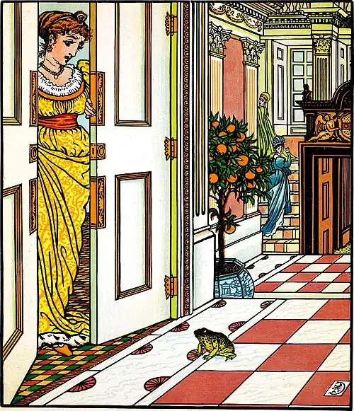 The next day, when the King’s daughter was sitting at table with her father and all his courtiers, and was eating from her own little golden plate, something was heard coming up the marble stairs, splish-splash, splish-splash; and when it arrived at the top, it knocked at the door, and a voice said, “Open the door, thou youngest daughter of the King! ”So she rose and went to see who it was that called her; but when she opened the door and caught sight of the Frog, she shut it again with great vehemence, and sat down at the table, looking very pale. But the King perceived that her heart was beating violently, and asked her whether it were a giant who had come to fetch her away who stood at the door. “Oh, no!” answered she; “it is no giant, but an ugly Frog.”