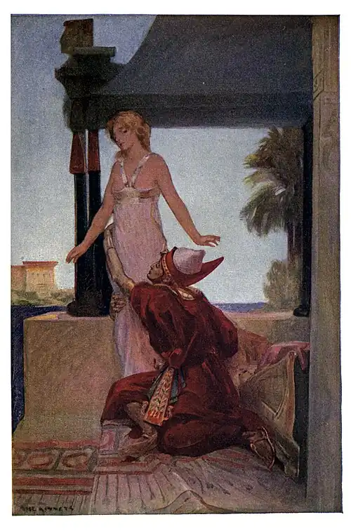 "Thou art beautiful, Neit-akrit … and at the throne of Isis thy hair gleamed red and hot, and made my eyes ache with its glow: thy veil but partly covered thee … and when I looked upon thee … it seemed to me that I would forfeit my double crown of Kamt to be allowed to look again, and perhaps see thee smile. And thou didst promise to be my wife … and Isis smiled down upon me. And she whispered that in the night … when she peeped through the fuchsia alleys … and looked on the lilies and lotus blossoms … thou and thy loveliness would be wholly mine."