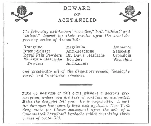 There is but one safeguard in the use of these remedies; to regard them as one would regard opium, and to employ them only with the consent of a physician who understands their true nature. Acetanilid has its uses, but not as a generic painkiller. Pain is a symptom; you can drug it away temporarily, but it will return, clamoring for more payment, until the final price is hopeless enslavement. Were the skull and bones on every box of this class of poison the danger would be greatly minimized.
