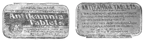 Were it obtainable, I would print here the full name and address of that attending physician, as one unfit, either through ignorance or carelessness, to practice his profession. And there would be other physicians all over the country who would, under that description, suffer the same indictment within their own minds for starting innocent patients on a destructive and sometimes fatal course. For it is the careless or conscienceless physician who gets the customer for the "ethical" headache remedies, and the customer, once secured, pays a profit, very literally, with his own blood. Once having taken Antikamnia, the laymen, unless informed as to its true nature, will often return to the drug store and purchase it with the impression that it is a specific drug, like quinin or potassium chlorate, instead of a disguised poison, exploited and sold under patent rights by a private concern. The United States Postoffice, in its broad tolerance, permits the Antikamnia company to send through the mails little sample boxes containing tablets enough to kill an ordinary man, and these sample boxes are sent not only to physicians, as is the rule with ethical remedies, but to lawyers, business men, "brain workers," and other prospective purchasing classes. The box bears the lying statement: "No drug habit - no heart effect."