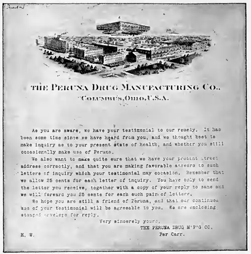 "As you are aware, we have your testimonial to our remedy. It has been some time since we have heard from you, and so we thought best to make inquiry as to your present state of health and whether you still occasionally make use of Peruna. We also want to make sure that we have your present street address correctly, and that you are making favorable answers to such letters of inquiry which your testimonial may occasion. Remember that we allow 25 cents for each letter of inquiry. You have only to send the letter you receive, together with a copy of your reply to the same, and we will forward you 25 cents for each pair of letters.