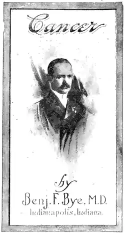 Across the street from the Dr. D. M. Bye offices is the "down-town office and laboratory" of Dr. B. F. Bye. In the circulars this is pictured as a large and commodious brick building, standing far back in an imposing shaded yard. The picture is purely imaginary. So is that of the doctor's "Sanatorium" in the same phamphlet. The B. F. Bye outfit is ensconced in a shabby wooden house close to the street, and the "office and laboratory" are little more imposing inside than outside. The younger Bye makes the preposterous claim of 82 per cent. of "complete recoveries." His "remedy" consists of a sort of paste of clay, glycerin, salicyclic acid and oil of wintergreen; a mixture of cathartics for internal use; a vaseline preparation; and the oil itself, which is ordinary commercial cottonseed oil with an infusion of vegetable matter, probably hyoscyamus. And with this combination he proposes to remove cancer and cure the condition that causes it! His treatment wouldn't remove a wart or cure a mosquito bite.