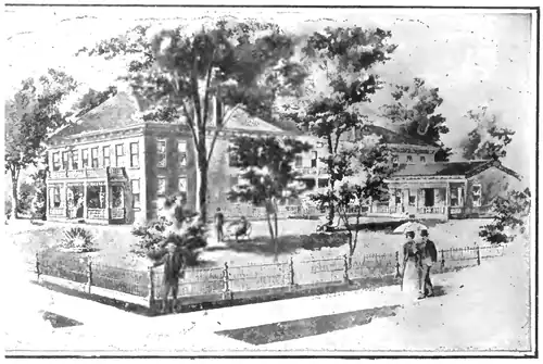 Dr. B. F. Bye's "down-town" office and laboratory, as represented in his booklets, surround by broad lawns and shade trees - which exists in Dr. Bye's mind only.