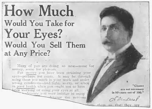 An Eastern ophthalmologist filled out of Dr. Oneal's diagnosis blanks with the unmistakable description of an incurable case of atrophy of the optic nerve, which the learned specialist promptly diagnosed as cataract, and offered to cure for fifty dollars. Strabismus (cross-eyes) is one of Dr. Oneal's specialties. I asked him how he cured this trouble without the knife to which he replied that he had never made such a claim. On the following day he sent to my hotel (for the purpose of proving that his methods were perfectly upright) a quantity of advertising matter, which he had apparently not censored, as it contained a diagnosis blank bearing these words: "Cross-eyes straightened in two minutes without knife, pain, or inconvenience." When this slight discrepancy was called to his attention he tried to explain it away by saying that he used "an instrument of my own invention." Technically, this instrument is a kind of scissors; but I fail to see how the patient who is lured to Dr. Oneal's office by promises of non-surgical cure ("Eye Diseases Cured Without Surgery" is the title of his book) suffers the less because the operator's instrument has two blades instead of one. Oneal says: