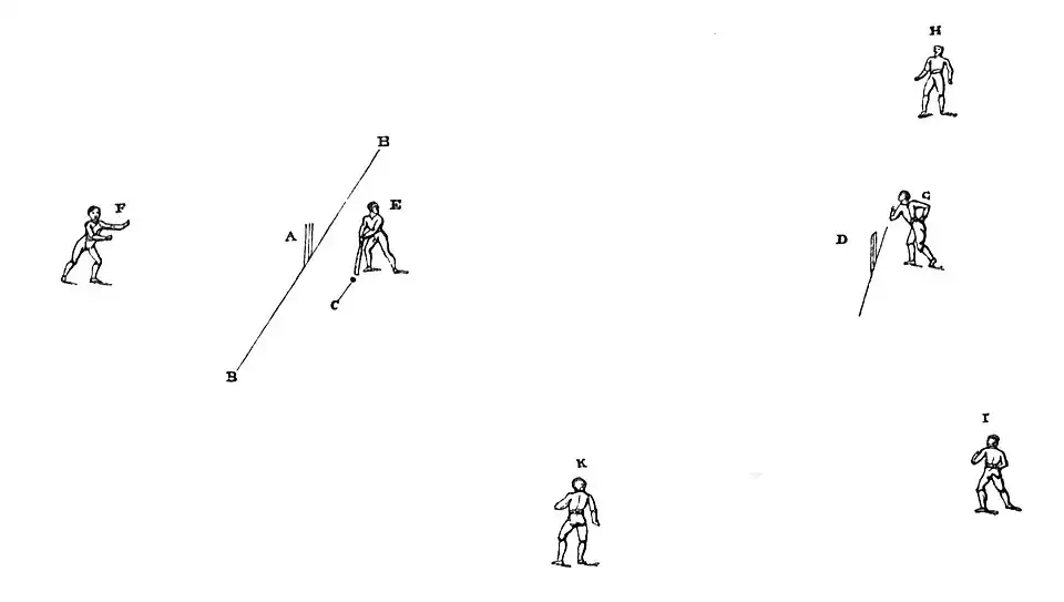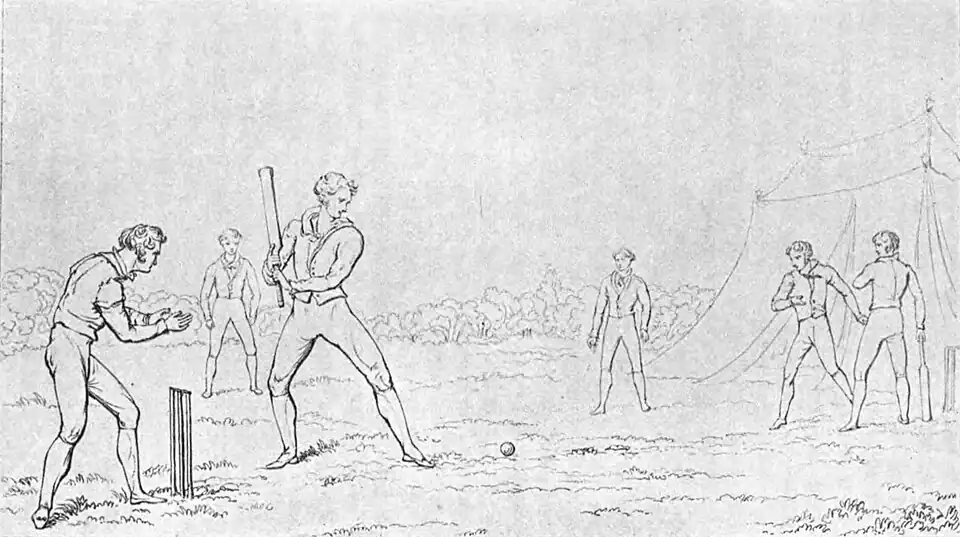 - ↑ The old cricketers were dressed differently from the modern. The gentlemen always played in breeches and silk stockings; the players, as Lord Winchelsea's, wore hats with gold binding, and ribbons of particular colour. The present dress is inconvenient as well as unbecoming; for trowsers may be in the way of the ball. Mr. Budd was the last cricketer who wore the old dress.