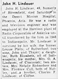 John H. Lindauer, 49, formerly of Bloomfield, died Saturday in the Desert Mission Hospital, Phoenix, Arizona. He was a radio and television engineer and was employed at the Harrison plant of Radio Corporation of America until transferred by the firm in 1948 to Indianapolis. Mr. Lindauer is survived by his wife, the former Louise Platts, of Rutherford; two sons, John and Thayer; a daughter, Ruth Elizabeth, all of Indianapolis; his mother, Mrs. O. A. Lindauer, of Cincinnati; two sister, Mrs. Natalie Richardson and Mrs. Florence Cull, both of Nutley, and a brother, Charles F. Lindauer, of Clifton.