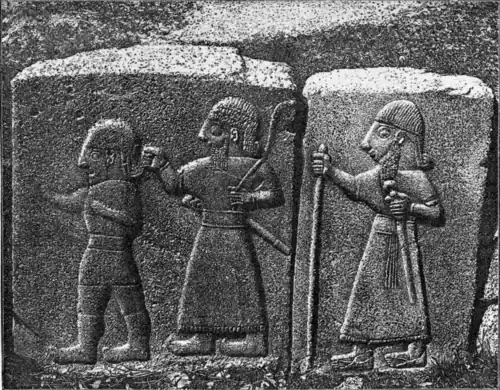 More than a century ago a German traveller had observed two figures carved on a wall of rock near Ibreez, or Ivris, in the territory of the ancient Lykaonia. One of them was a god, who carried in his hand a stalk of corn and a bunch of grapes, the other was a man, who stood before the god in an attitude of adoration. Both figures were shod with boots with upturned ends, and the deity wore a tunic that reached to his knees, while on his head was a peaked cap ornamented with horn-like ribbons. A century elapsed before the sculpture was again visited by an European traveller, and it was again a German who found his way to the spot. On this occasion a drawing was made of the figures, which was published by Ritter in his great work on the geography of the world. But the drawing was poor and imperfect, and the first attempt to do adequate justice to the original was made by the Rev. E. J. Davis in 1875. He published his copy, and an account of the monument, in the Transactions of the Society of Biblical Archæology the following year. He had noticed that the figures were accompanied by what were known at the time as Hamathite characters. Three lines of these were inserted between the face of the god and his uplifted left arm, four lines more were engraved behind his worshipper, while below, on a level with an aqueduct which fed a mill, were yet other lines of half-obliterated hieroglyphs. It was plain that in Lykaonia also, where the old language of the country still lingered in the days of St. Paul, the Hittite system of writing had once been used.