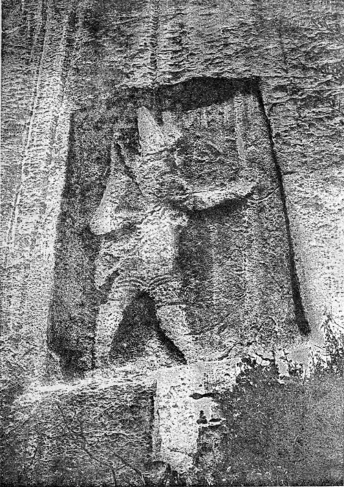 The sculpture sketched by Texier had subsequently been photographed by Mr. Svoboda. It represents a warrior whose height is rather more than life-size, and who stands in profile with the right foot planted in front of him, in the attitude of one who is marching. In his right hand he holds a spear, behind his left shoulder is slung a bow, and the head is crowned with a high peaked cap. He is clad in a tunic which reaches to the knees, and his feet are shod with boots with turned-up ends. The whole figure is cut in deep relief in an artificial niche, and between the spear and the face are three lines of hieroglyphic characters. The figure faces south, and is carved on the face of the eastern cliff of Karabel.