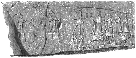 The lintel of the palace gate at Eyuk was of solid stone, and, if Professor Perrot is right, the huge stone lintel, adorned with a lion's head, still lies in fragments on the ground. The entrance was flanked with walls on which bas-reliefs were carved, as in the palaces which were built by the kings of Assyria. They formed, in fact, a dado, the rest of the wall above them being probably of brick covered with stucco and painted with bright colours. Many of the sculptured blocks still lie scattered on the ground. Here we have the picture of a priest before an altar, there of a sacred bull mounted on a pedestal. Hard by is the likeness of two men, one of whom carries a lyre, the other a goat; while on another stone a man is represented with little regard to perspective in the act of climbing a ladder. Another relief introduces to us three rams and a goat whose horn is grasped by a shepherd; elsewhere again we see a goddess seated in a chair of peculiar construction, with her feet upon a stool and objects like flowers in her hand. A similar piece of sculpture has been found at Merash, on the southern side of the Taurus, within the limits of the ancient Komagênê, even such details as the form of the chair and stool being alike in the two cases. The two reliefs might have been executed by the same hand.