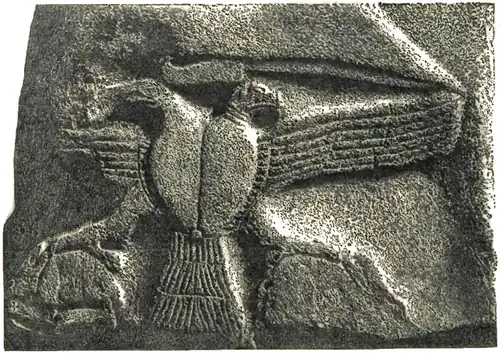 Boghaz Keui and Eyuk are situated in the district known as Pteria to the Greeks. At Eyuk there are remains of a vast palace, which stood on an artificial platform of earth, like the palaces of Assyria and Babylon. The walls of the palace, formed of huge blocks of cut stone, can still be traced in many places. It was approached by an avenue of sculptured slabs, on which lions were represented, some of them in the act of devouring a ram. The head and attitude of one that is preserved remind us of the avenue of ram-headed sphinxes which led to the temple of Karnak at Thebes. The entrance of the palace was flanked on either side by two enormous monoliths of granite, on the external faces of which were carved in relief the images of a sphinx. But though the artist had clearly gone to Egypt for his model, it is also clear that he had modified the forms he imitated in accordance with national ideas. The head-dress, like the feet, of the sphinxes is non-Egyptian, the necklace passes under the chin instead of falling across the breast, and the sphinx itself is erect, not recumbent, as in Egypt. On the right hand the same block of stone which bears the figure of the sphinx bears also, on the inner side, the figure of a double-headed eagle, with an animal which Professor Perrot believes to be a hare in either talon, and a man standing upon its twofold head. The same double-headed eagle, supporting the figure of a man or a god, is met with at Boghaz Keui, and must be regarded as one of the peculiarities of Hittite symbolism and art. The symbol was adopted in later days by the Turkoman princes, who had perhaps first seen it on the Hittite monuments of Kappodokia; and the Crusaders brought it to Europe with them in the 14th century. Here it became the emblem of the German Emperors, who have passed it on to the modern kingdoms of Russia and Austria. It is not the only heirloom of Hittite art which has descended to us of to-day.