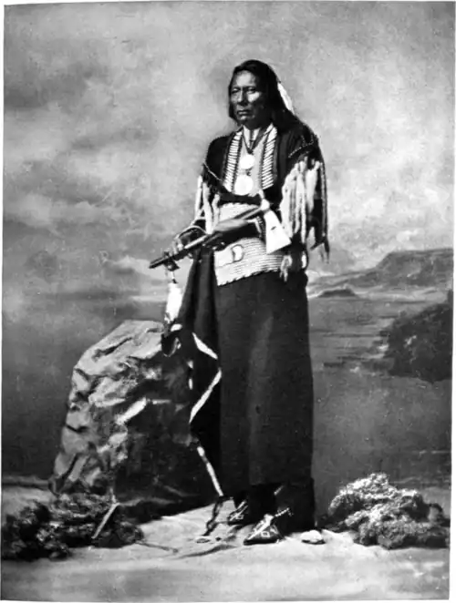 Liberty! Bereft of homes and goods, mourning their many dead, yet Liberty came to these benighted Indians as a ray of light in the darkness. Standing Bear, taking from his few treasures a war-bonnet, a tomahawk, and a pair of buckskin leggings, sought out his three greatest benefactors—the gentleman who had first discovered his distress, and the two attorneys who conducted his case without expectation of reward—and presented to them the simple tokens of his gratitude: