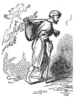 WATER CARRIER. with greedy looks, and swallow unconsciously every time he swallows, as if they half fancied the precious morsel went down their own throats—hurry up the caravan!—I never shall enjoy a meal in this distressful country. To think of eating three times every day under such circumstances for three weeks yet—it is worse punishment than riding all day in the sun. There are sixteen starving babies from one to six years old in the party, and their legs are no larger than broom handles. Left the fountain at 1 P. M. (the fountain took us at least two hours out of our way,) and reached Mahomet’s lookout perch, over Damascus, in time to get a good long look before it was necessary to move on. Tired? Ask of the winds that far away with fragments strewed the sea.”