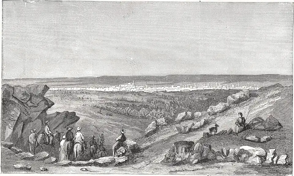 Damascus dates back anterior to the days of Abraham, and is the oldest city in the world. It was founded by Uz, the grandson of Noah. “The early history of Damascus is shrouded in the mists of a hoary antiquity.” Leave the matters written of in the first eleven chapters of the Old Testament out, and no recorded event has occurred in the world but Damascus was in existence to receive the news of it. Go back as far as you will into the vague past, there was always a Damascus. In the writings of every century for more than four thousand years, its name has been mentioned and its praises sung. To Damascus, years are only moments, decades are only flitting trifles of time. She measures time, not by days and months and years, but by the empires she has seen rise, and prosper and crumble to ruin. She is a type of immortality. She saw the foundations of Baalbec, and Thebes, and Ephesus laid; she saw these villages grow into mighty cities, and amaze the world with their grandeur—and she has lived to see them desolate, deserted, and given over to the owls and the bats. She saw the Israelitish empire exalted, and she saw it annihilated. She saw Greece rise, and flourish two thousand years, and die. In her old age she saw Rome built; she saw it overshadow the world with its power; she saw it perish. The few hundreds of years of Genoese and Venetian might and splendor were, to grave old Damascus, only a trifling scintillation hardly worth remembering. Damascus has seen all that has ever occurred on earth, and still she lives. She has looked upon the dry bones of a thousand empires, and will see the tombs of a thousand more before she dies. Though another claims the name, old Damascus is by right the Eternal City.